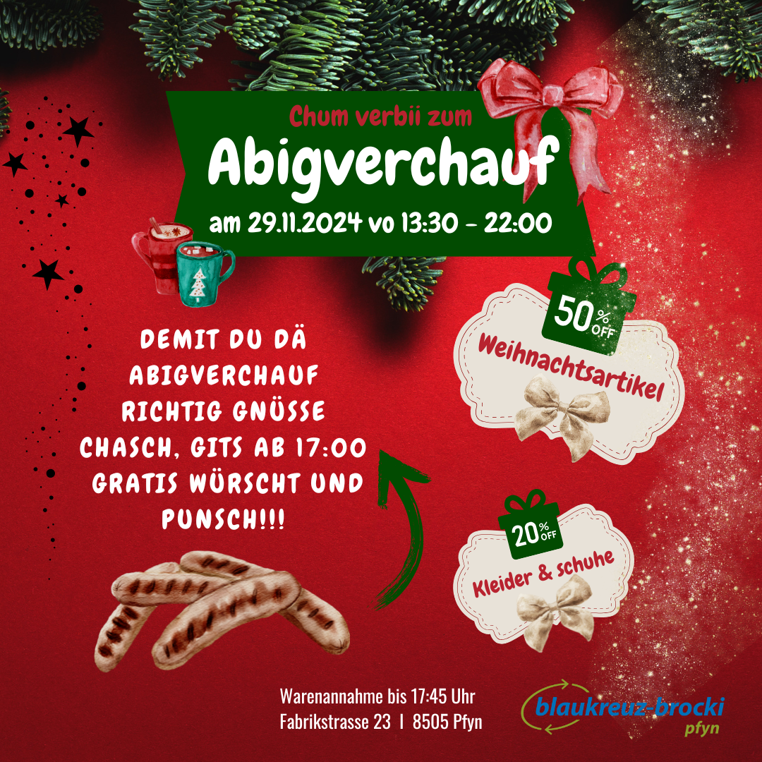 Damit du dich in aller Ruhe auf eine spannende Schatzsuche durch die Brocki machen kannst, werden ab 17 Uhr Würste vom Grill und Punsch bereitstehen.