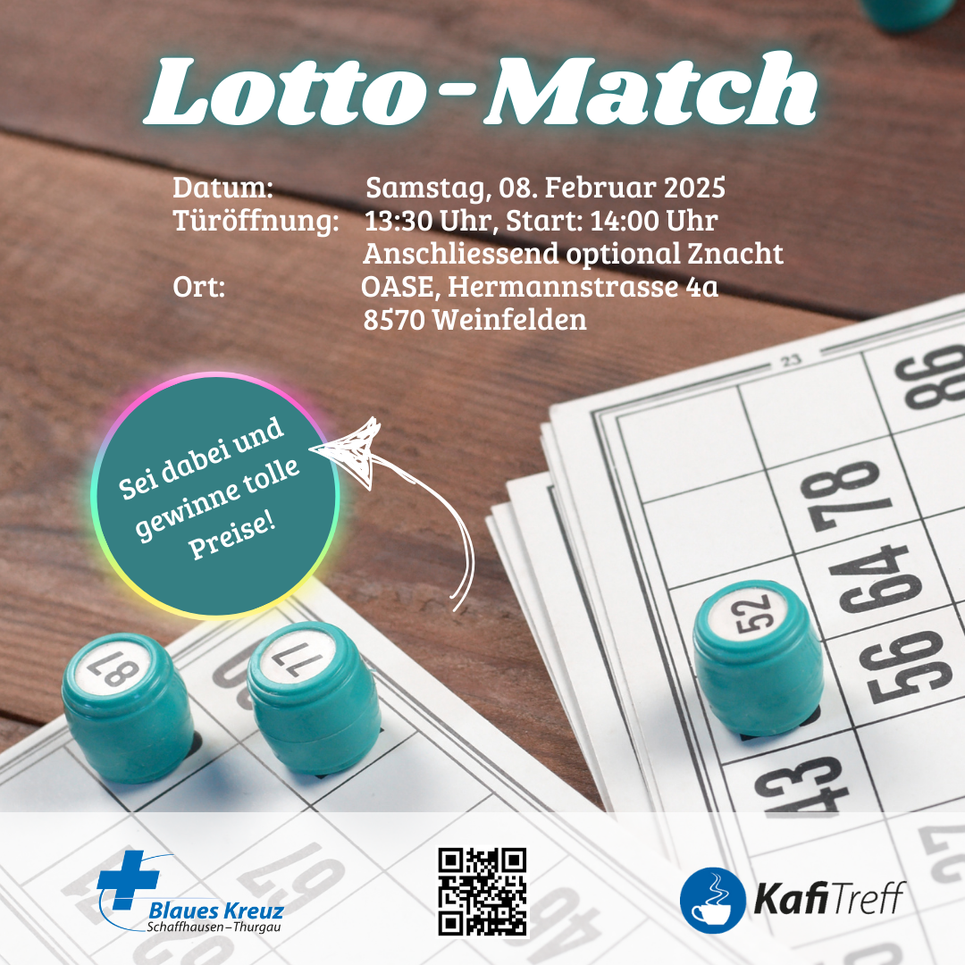 Am 08. Februar werden in der OASE wieder Zahlen gezogen. Wir laden herzlich zum nächsten Lottomatch ein. Attraktive Preise warten auf die Gewinnenden! Um 13.30 Uhr werden die Türen geöffnet, um 14 Uhr beginnt das Spiel. Im Anschluss gibt es optional für hungrige Bäuche ein einfaches Abendessen. Lass dir diesen Anlass nicht entgehen!